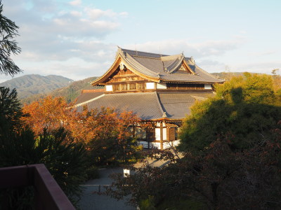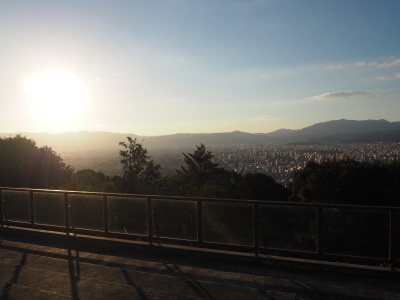 西展望台から見る左下の将軍塚と中央青龍殿が西日に染まる