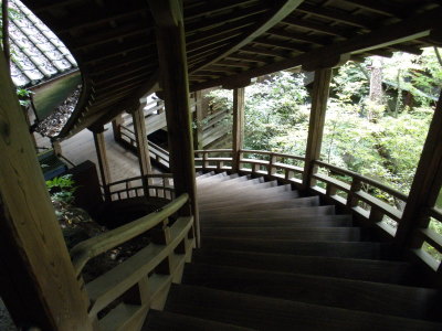 臥龍廊は、山の斜面に合わせて、巧みに木を組み合わせて作った廊下です。曲がっているところから、龍が寝そべっている(臥している)ように見えることから「臥龍廊」の名が付けられました。