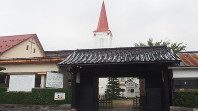 入るときは駐車場の側面から入りましたが、正面より出ようとしますと、教会なのに、入口は純和風の門でした。もともとは庄内藩家老・末松十蔵の屋敷だったので、その門を文化財として残しているようです。