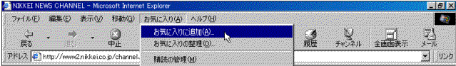 例えば日経新聞をIEで毎日見る場合には、まず日経新聞のWEBページを画面上に開いておきます。[お気に入り]−[お気に入りに追加]で登録することができます。登録されるとお気に入り一覧表に表示されますので、登録されているWEBページを見るには登録された名前をクリックすればよいのです。